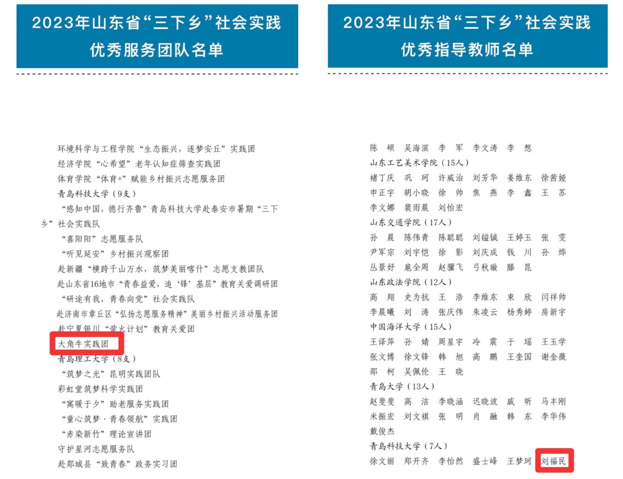 近日,共青团山东省委联合省委宣传部、省教育厅等单位对在2023年“调研山东”——暑期“三下乡”社会实践活动中表现突出的单位、团队和个人进行通报表扬。yl23411永利“大角牛实践团”获评省级“优秀服务团队”称号,辅导员刘福民获评省级社会实践“优秀指导教师”称号。