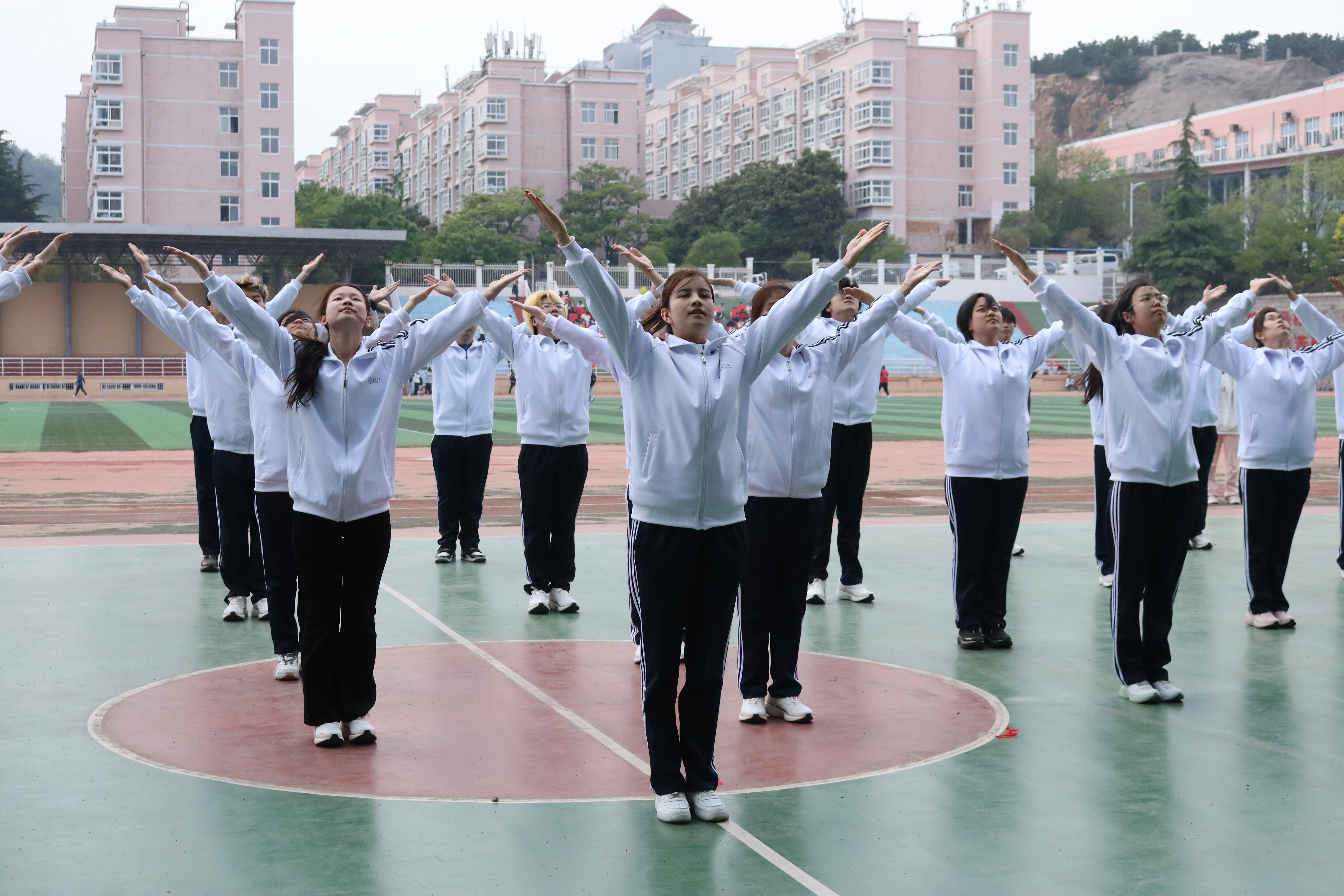 现场领导老师与同学们共同观看了学院广播体操、运动会方队等训练成果展示,在激昂的进行曲与律动的体操曲中,同学们步伐协调一致,动作整齐划一,赢得了师生阵阵掌声。