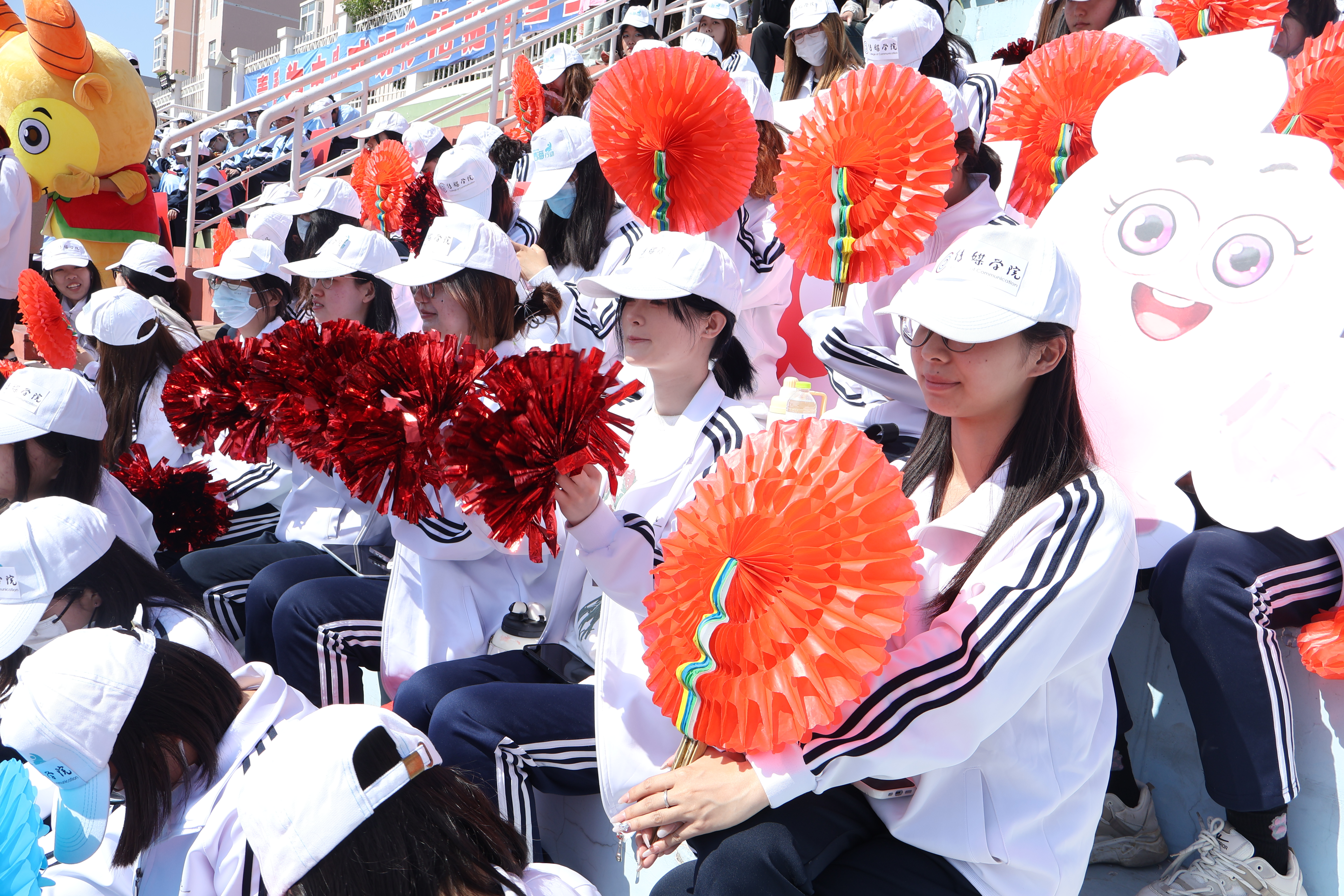 看台上,传媒学子挥舞着花球和展板,