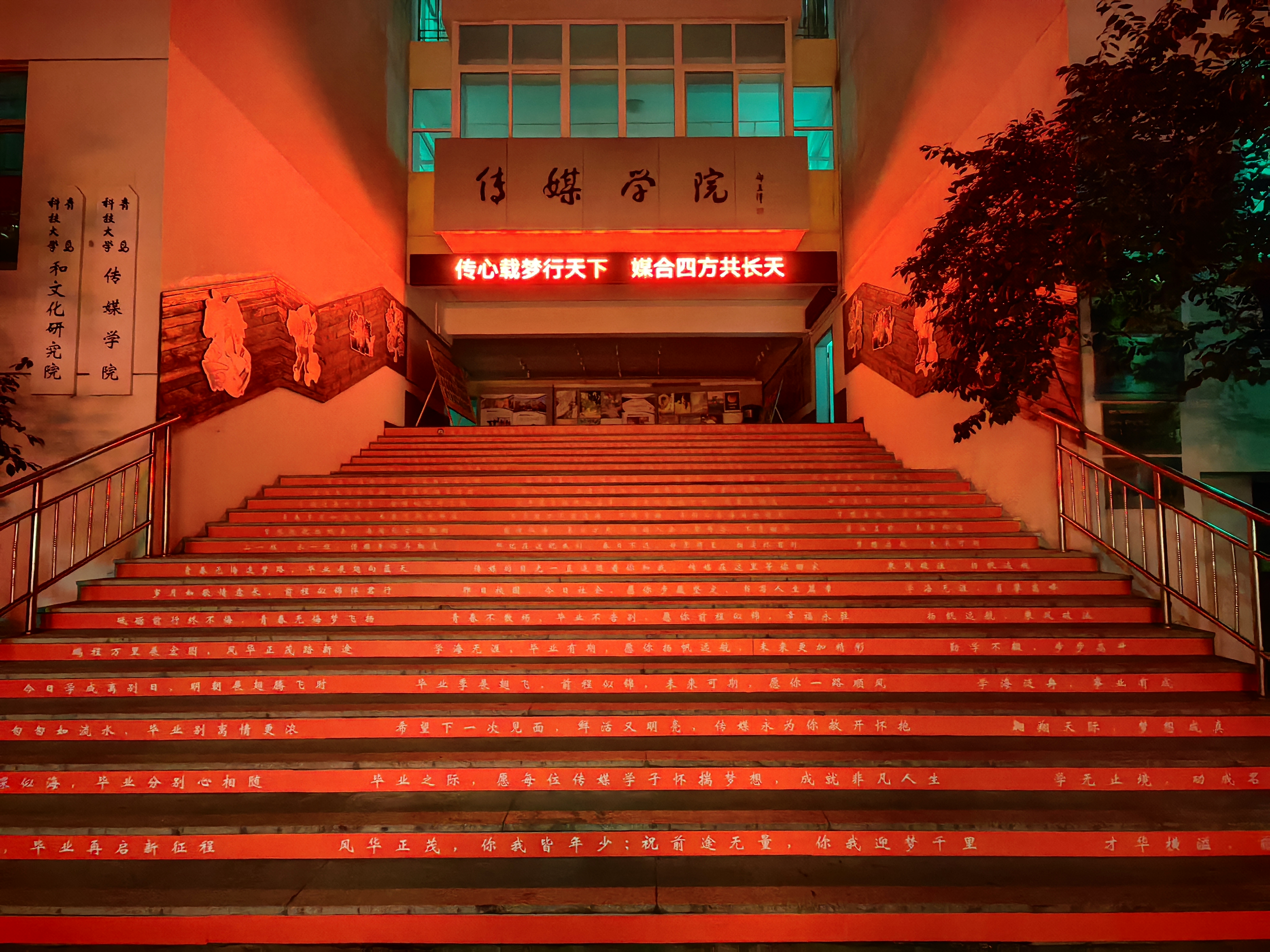 二是布置多重元素,精心营造毕业氛围。公司在门口电子屏设置祝福短语,在台阶处贴满毕业寄语,有专业特色的动漫形象张贴在台阶两侧,考研光荣榜、毕业作品图集等有序陈列,供毕业生打卡、拍照留念,留下属于“传媒”的独家记忆。